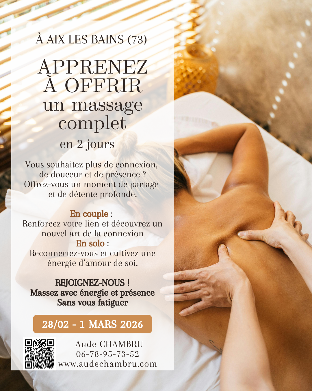 Deux jours pour apprendre à masser, à ancrer, à apaiser — et à renouer avec votre énergie vitale.
